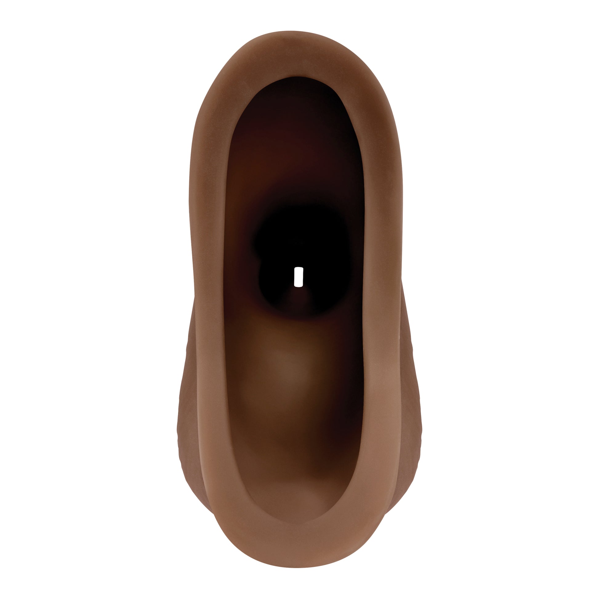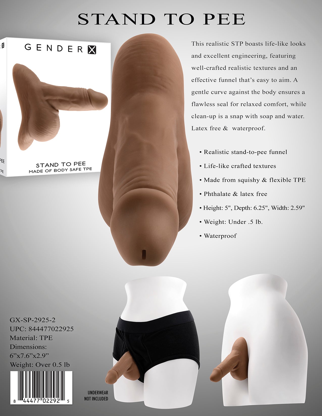 Gender X Stand To Pee Dark Skin Tone Thermoplastic Elastomers TPE from Evolved Novelties. This realistic STP boasts life like looks and excellent engineering, featuring well crafted realistic textures and an effective funnel that is easy to aim. A gentle curve against the body ensures a flawless seal for relaxed comfort, while clean up is a snap with soap and water. Latex free. And waterproof, non-vibrating dildo. Realistic Stand To Pee funnel dildo. Life like crafted textures