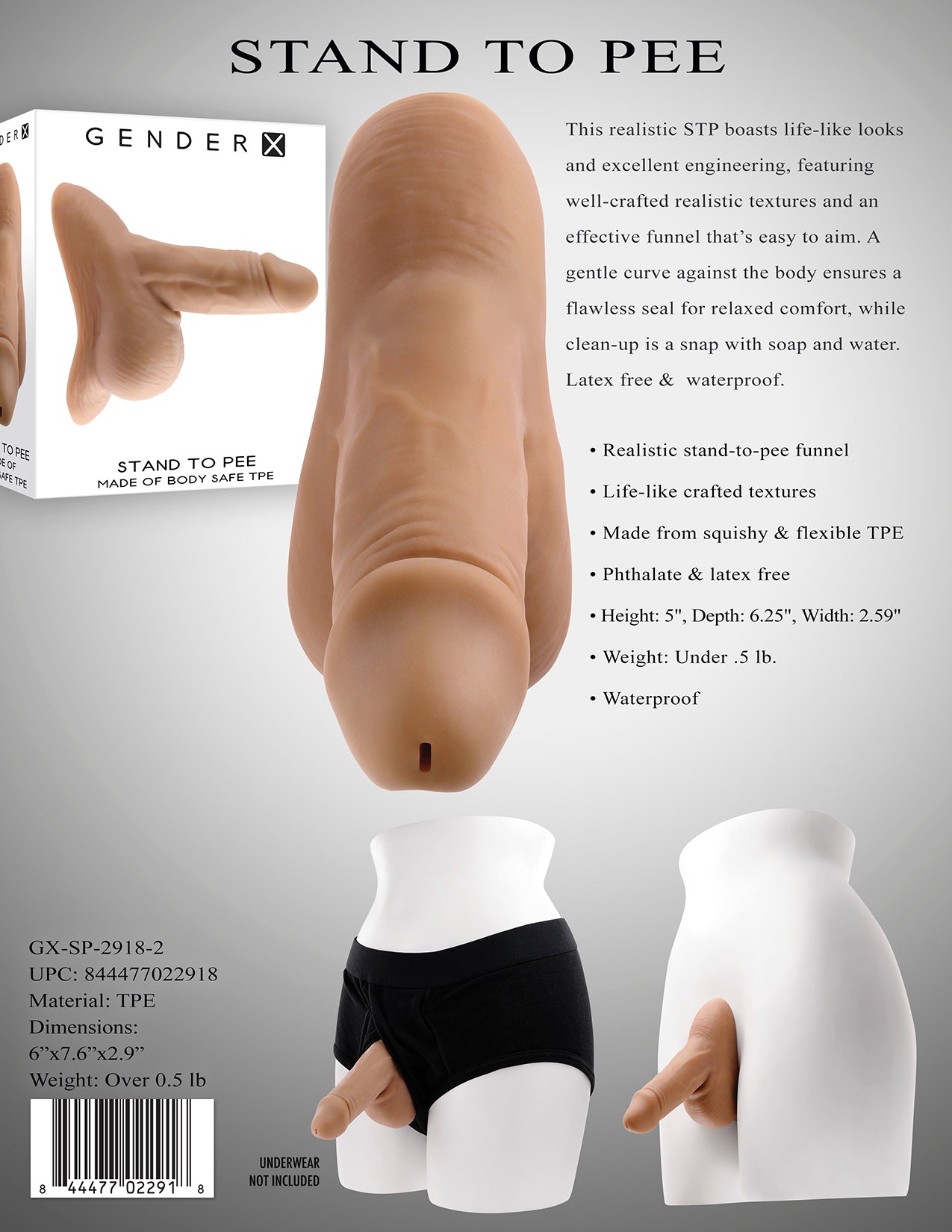 Gender X Stand To Pee Medium Skin Tone Thermoplastic Elastomers TPE from Evolved Novelties. This Realistic Stand To Pee aka STP boasts life like looks and excellent engineering, featuring well crafted realistic textures and an effective funnel that is easy to aim. A gentle curve against the body ensures a flawless seal for relaxed comfort, while clean up is a snap with soap and water. Latex free. And waterproof, non-vibrating dildo. Realistic Stand To Pee Funnel Dildo. Life like crafted textures Made from squishy, flexible Thermoplastic Elastomers TPE. Phthalate free and latex free. Size height 5 inches, depth 6.25 inches, width 2.59 inches. Weight under half a pound. Waterproof. Please note Underwear is not included. 5 years warranty. Categories: Naughty Role Play, Dildos, Dongs, Penis Sleeves, French Ticklers, Fleshlight, Packers, Dildos and Dongs Realistic. Video. 2023.