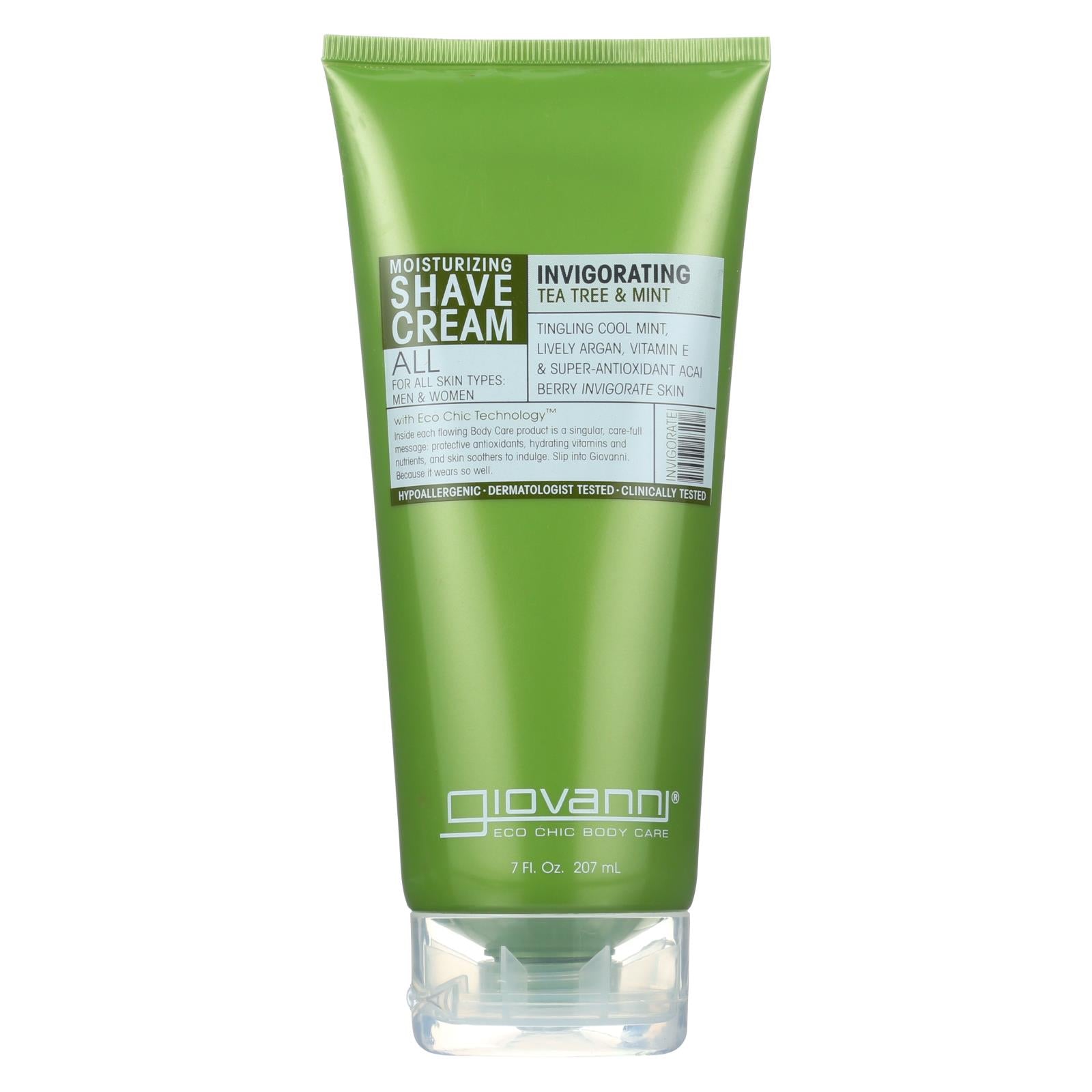Giovanni eco chic body care invigorating tea tree & mint moisturizing shave cream soothes all skin types. Eco chic technology in this 7 fl. Oz. Tube delivers a rich blend of vitamin e, antioxidants including acai berry and moisturizers including shea butter and argan oil. Dermatologist tested, this hypoallergenic shave cream has only vegetarian ingredients and contains no sulfates, parabens or dyes. Experience a clean, smooth and exciting shave that leaves your skin feeling creamy soft.