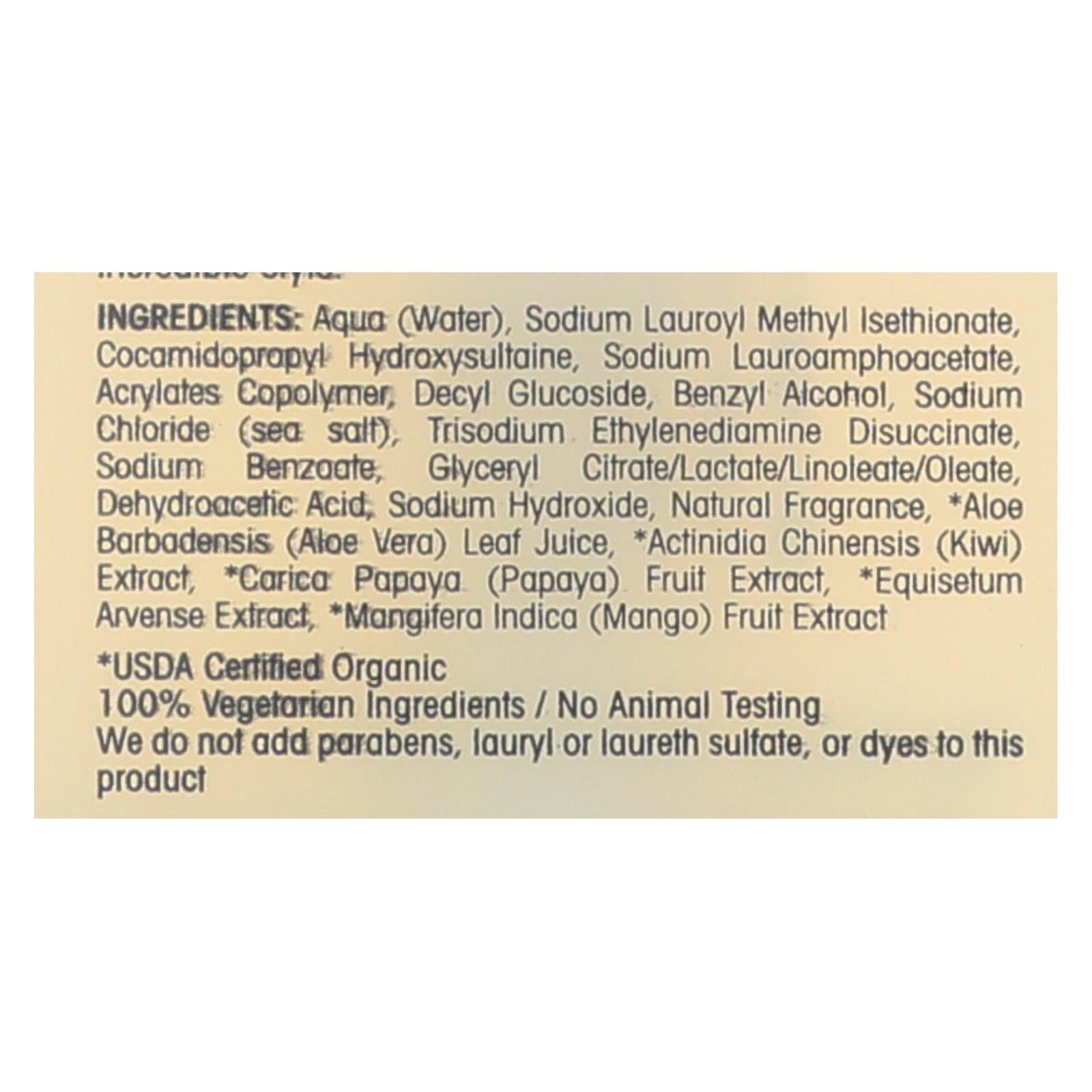 ingredients : aqua;water;sodium lauroyl methyl isethionate;cocamidopropyl hydroxysultaine;sodium lauroamphoacetate;acrylates copolymer;decyl glucoside;benzyl alcohol;sodium chloride;sea salt;trisodium ethylenediamine disuccinate;sodium benzoate;glyceryl citrate/lactate/linoleate/oleate;dehydroacetic acid;sodium hydroxide;natural fragrance;aloe barbadensis;aloe vera;leaf juice;‘actinidia chinensis;kiwi;extract;carica papaya;papaya;fruit extract;equisetum arvense extract;mangifera indica;mango