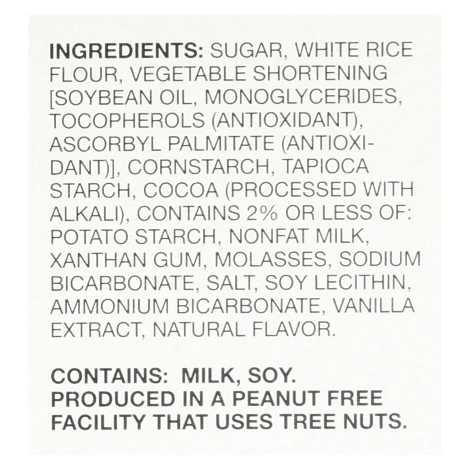 ingredients : sugar;white rice flour;vegetable shortening [soybean oil;monoglycerides;tocopherols;antioxidant;ascorbyl palmitate;];cornstarch;tapioca starch;cocoa;processed with alkali;contains 2% or less of: potato starch;nonfat milk;xanthan gum;molasses;sodium bicarbonate;salt;soy lecithin;ammonium bicarbonate;vanilla extract;natural flavor