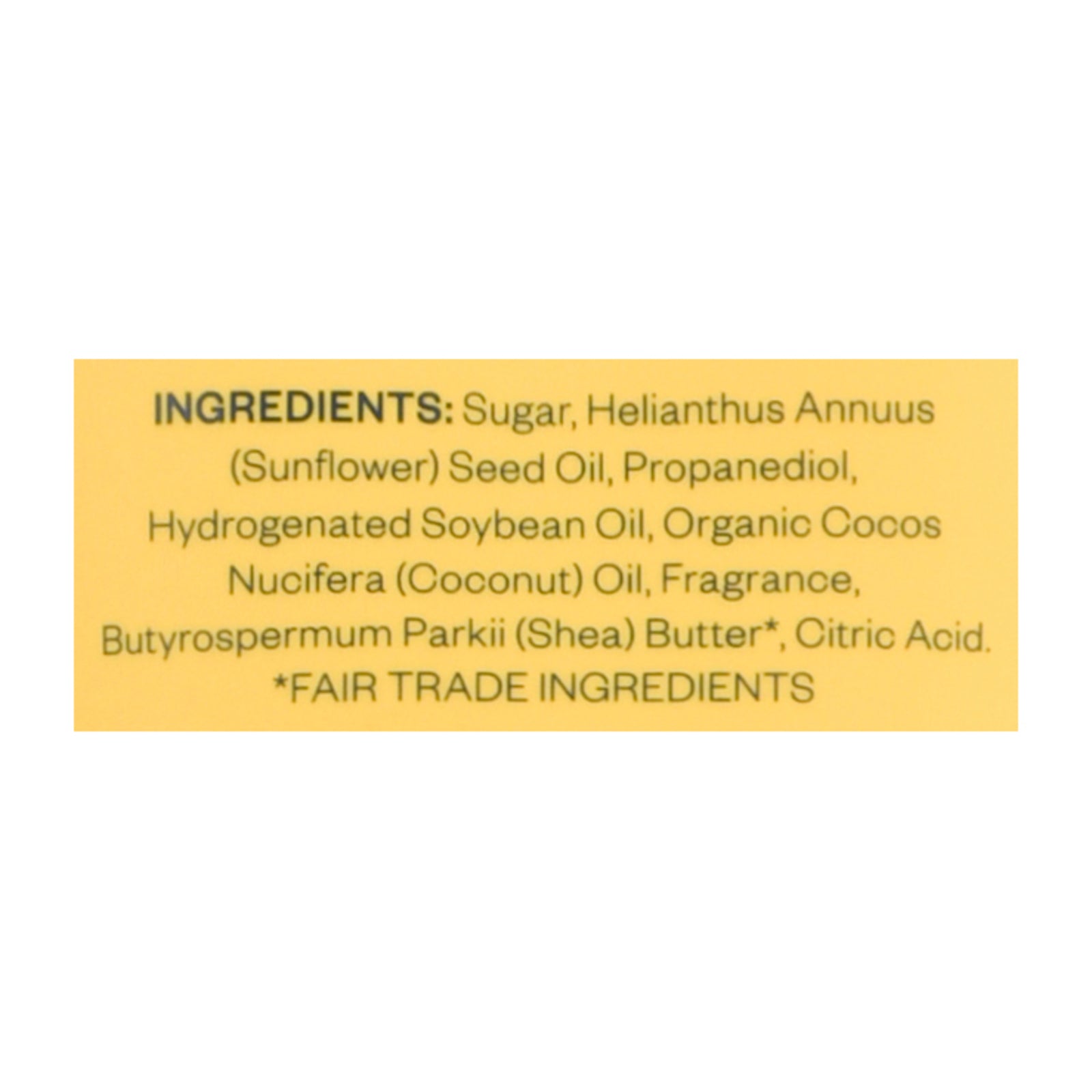 ingredients : sugar;helianthus annuus (sunflower) seed oil;propanediol;hydrogenated soybean oil;organic cocos nucifera (coconut) oil;fragrance;butyrospermum parkii (shea) butter;citric acid