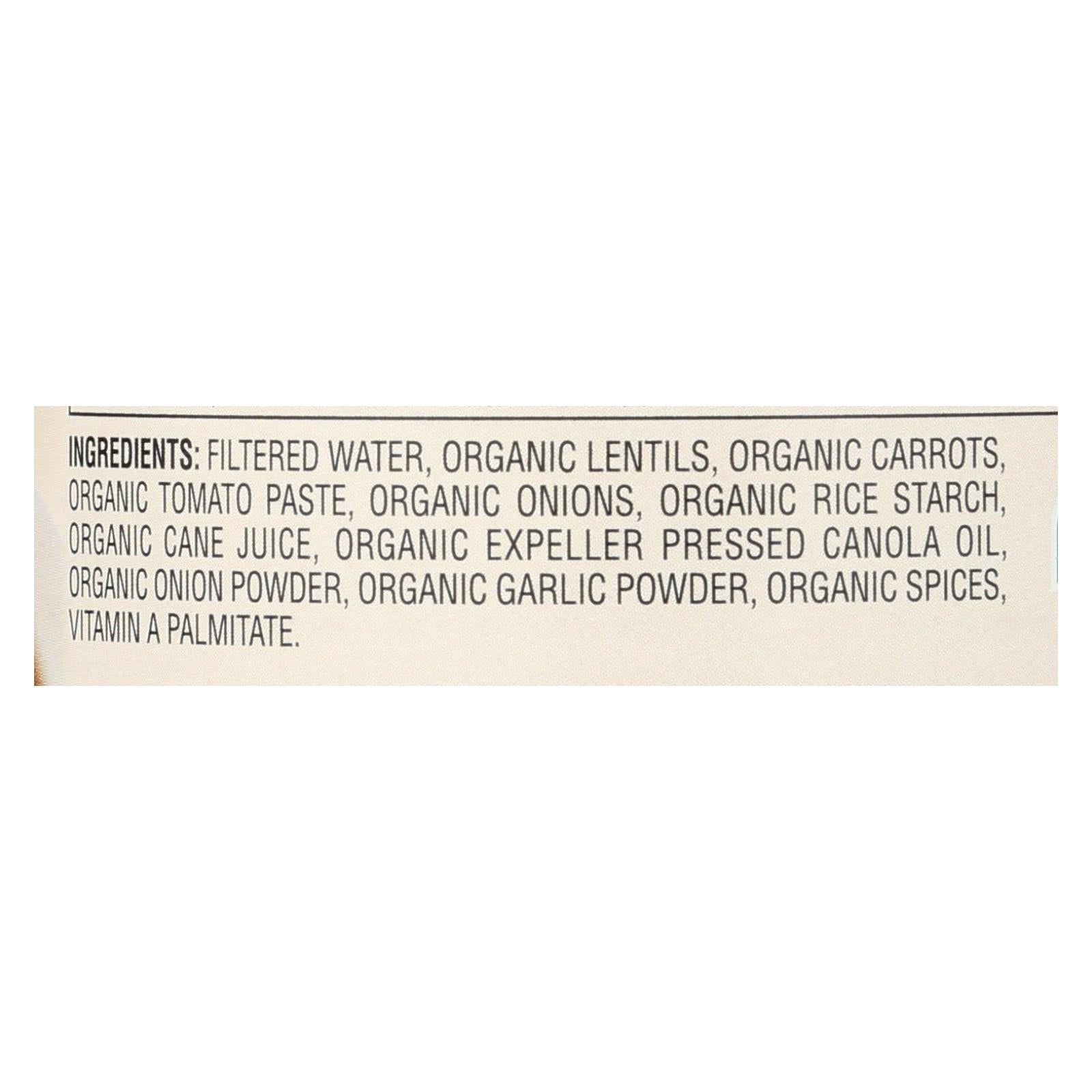 ingredients : filtered water;organic lentil beans;organic tomato paste;organic carrots;organic onions;organic rice starch;organic evaporated cane sugar;organic expeller pressed canola oil;organic onion powder;organic garlic powder;organic spices;vitamin a palmitate