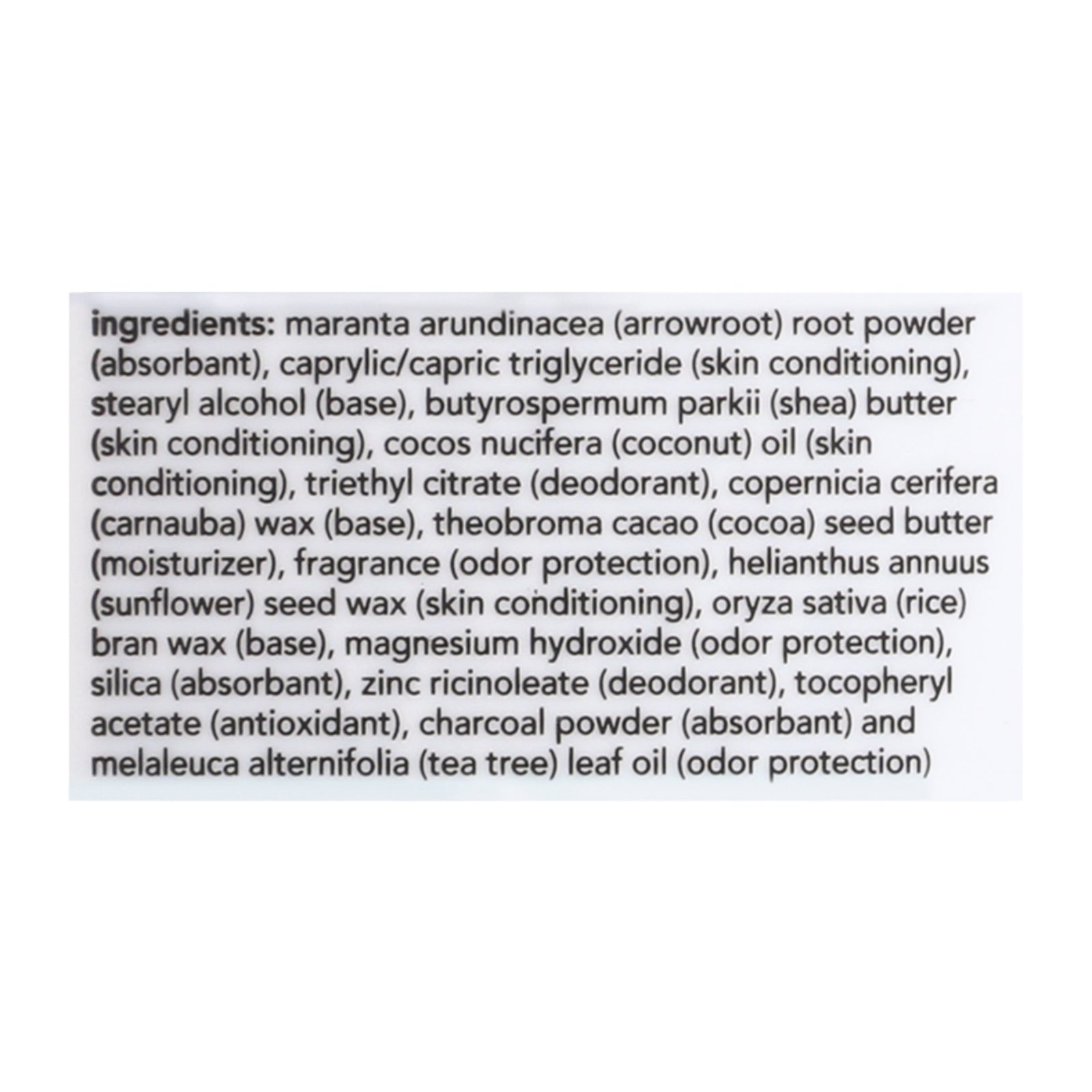 ingredients : maranta arundinacea;arrowroot;root powder;absorbant;caprylic/capric triglyceride;skin conditioning;stearyl alcohol;base;butyrospermum parkii;shea;butter;cocos nucifera;coconut;oil;triethyl citrate;deodorant;copernicia cerifera;carnauba;wax;theobroma cacao;cocoa;seed butter;moisturizer;fragrance;odor protection;helianthus annuus;sunflower;seed wax;oryza sativa;rice;bran wax;magnesium hydroxide;silica;zinc ricinoleate;tocopheryl acetate;antioxidant;charcoal powder;and melaleuca alternifolia;tea tr