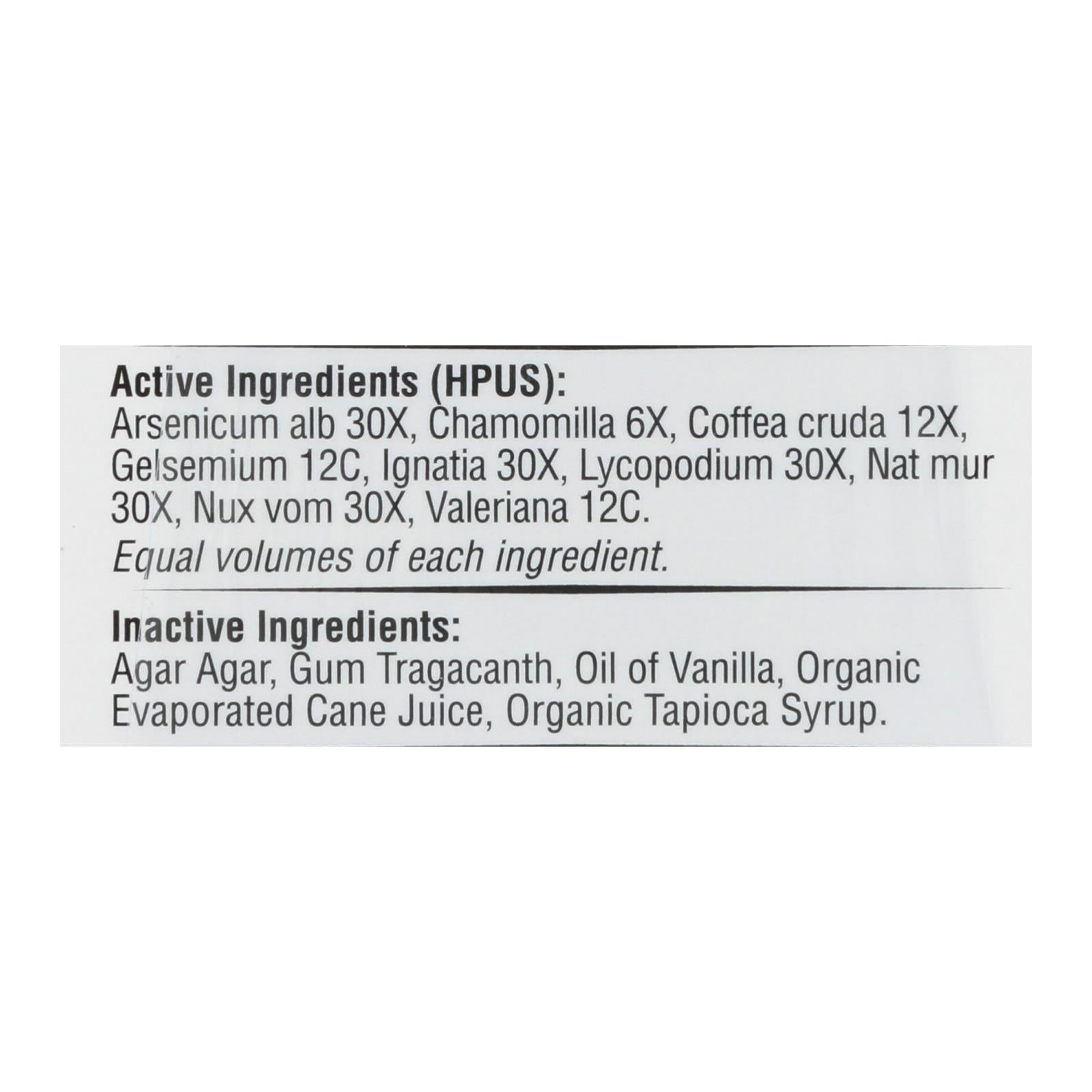 ingredients : agar agar;gum tragacanth;oil of vanilla;organic evaporated cane juice;organic tapioca syrup;arsenicum alb 30x;chamomilla 6x;coffea cruda 12x;gelsemium 12c;ignatia 30x;lycopodium 30x;nat mur 30x;nux vom 30x;valeriana 12c