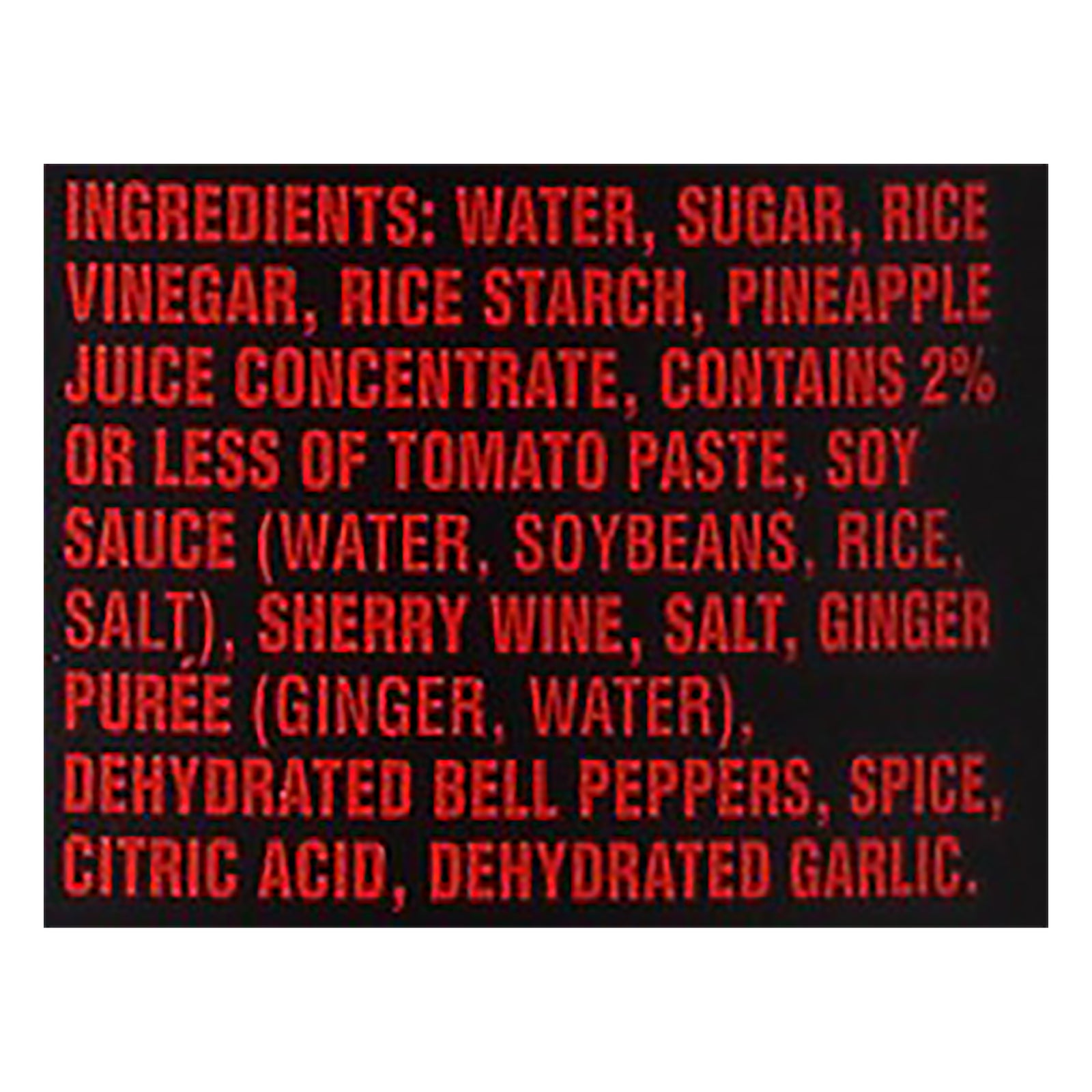 ingredients : water;sugar;vinegar;modified cornstarch;pineapple juice concentrate;tomato paste;soy sauce;wheat;soybeans;salt;sodium benzoate [preservative];dehydrated bell peppers. Salt;sherry wine;paprika extract;citric acid;sodium benzoate;preservative;natural flavor