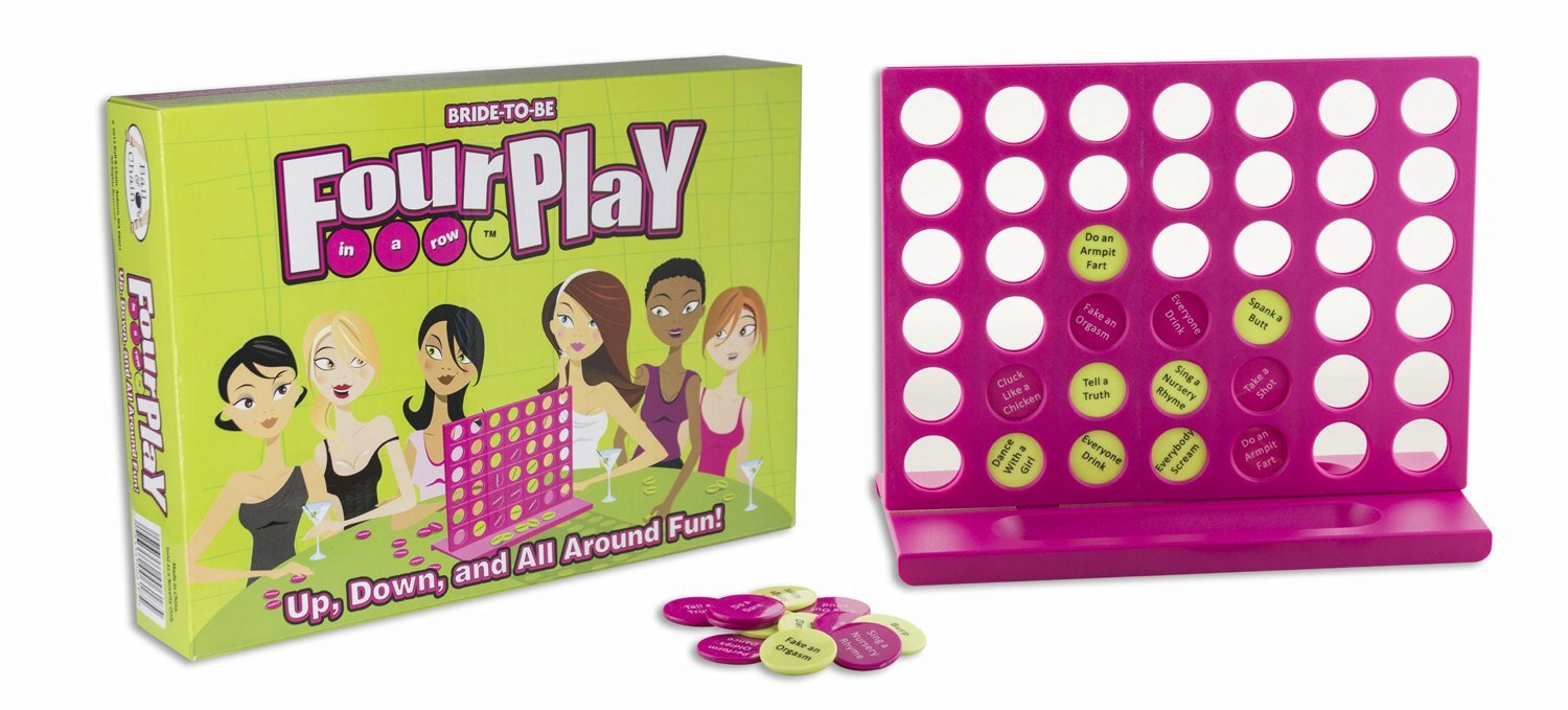 Bride To Be Four Play Game. By adding a contemporary twist, Ball and Chain has updated the classic four in a row game. The result is a super exciting, ultra fun girl's night out party game that will bring tons of side-splitting laughter. Both ridiculous and outrageous, Four Play in a Row is guaranteed to provide countless hours of entertainment!